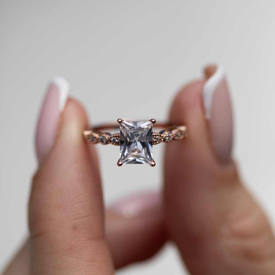 Meet “The Caroline'', a ring that embraces the essence of elegance and sophistication. Hand crafted with precision, this exquisite piece features a moissanite diamond that catches the light with every movement, radiating brilliance and clarity.