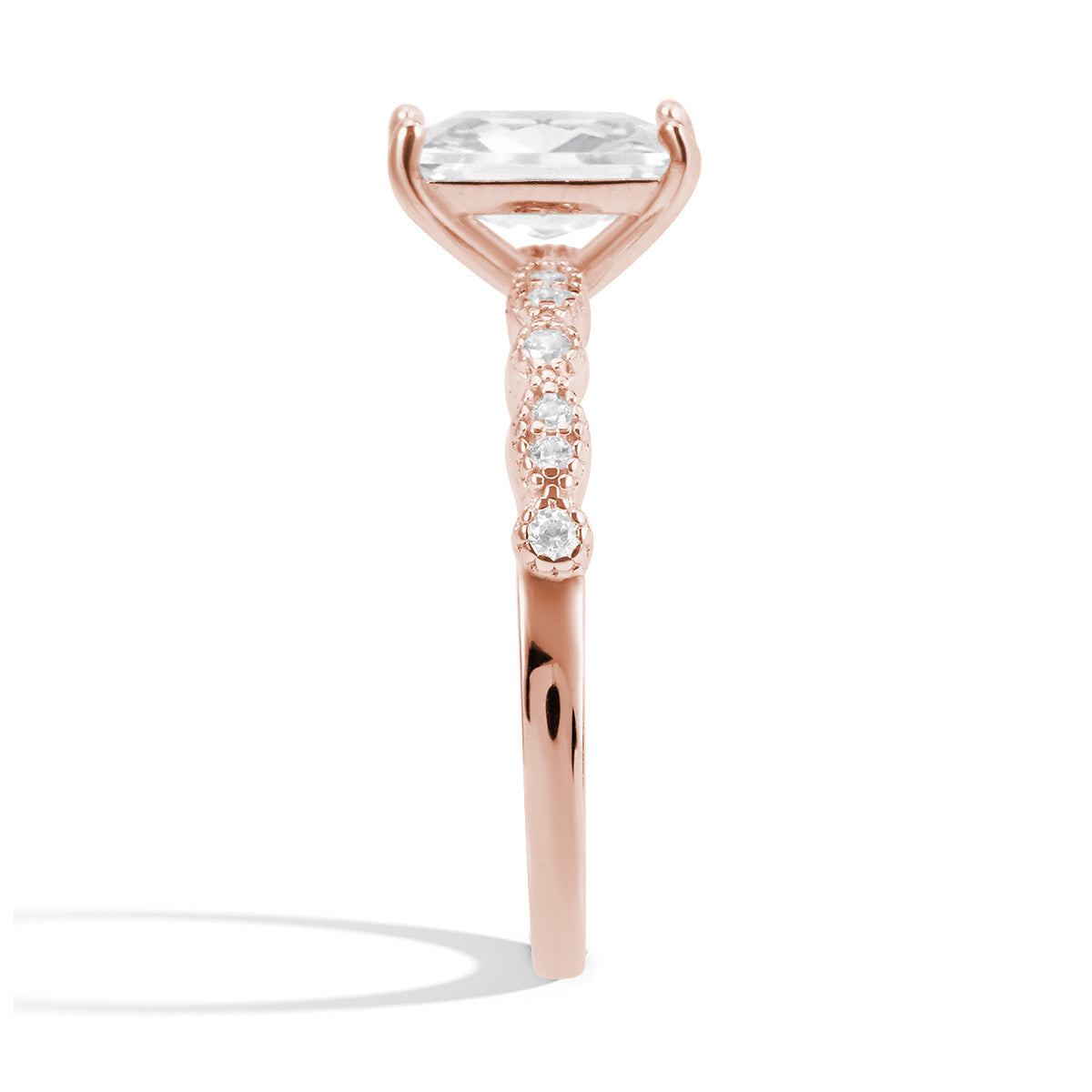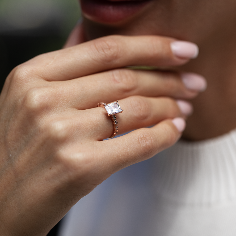 Meet “The Caroline'', a ring that embraces the essence of elegance and sophistication. Hand crafted with precision, this exquisite piece features a moissanite diamond that catches the light with every movement, radiating brilliance and clarity.